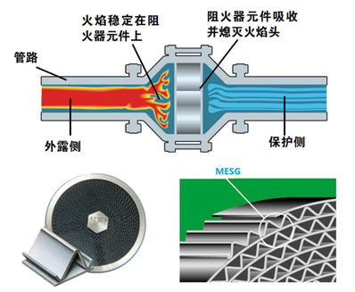 波形型管道阻火器由殼體、進(jìn)出口法蘭和芯片三部分構成。其中波形芯片是阻火器的核心部件,由數量眾多的三角形單元組成,且三角形高度小于最大試驗安全空間MESG(該參數是按測試標準IEC79一1A進(jìn)行測試時(shí),火焰能夠通過(guò)的最小縫隙高度),以確保絕對安全。由于有小三角形流體通道,流體的流動(dòng)阻力大大降低,且不易堵塞。芯片的材料為標準的316或316L等不銹鋼,具有一定的抗腐蝕性且不易變形,使用壽命長(cháng)。