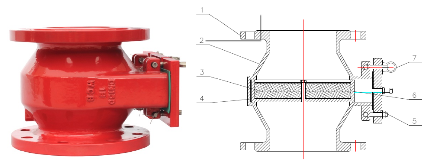 1、連接法蘭;2、閥體;3、波紋阻火板;4、固定板;5、阻火匣門(mén)蓋;6、阻火匣;7、快開(kāi)螺栓;