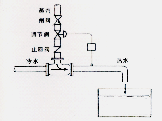 汽水混合器主要由噴管、殼體、網(wǎng)板等部分組成。被加熱水通過(guò)呈拉伐爾狀的噴管時(shí),蒸氣從汽水混合器噴管外側通過(guò)管壁上許多斜向小噴頭噴入水中,兩者在高速流動(dòng)中瞬間良好混合,以達到加熱的目的。調節蒸氣側閥門(mén),就可得到所需溫度的熱水。