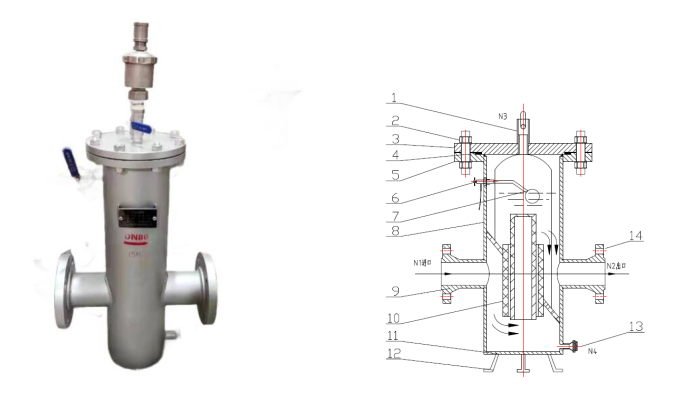 1、排氣口;2緊固件;3、筒體盲板;4、墊片;5、筒體法蘭;6、側部排氣口;7、浮球裝置;8、筒體;9、進(jìn)口法蘭;10、濾籃;11、底板;12、支腿;13、放凈口;14、出口法蘭;