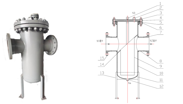 1、吊環(huán);2、排氣口;3、緊固件;4、筒體盲板;5、墊片;6、筒體法蘭;7、出口法蘭;8、進(jìn)出口接管;9、濾籃;10、筒體;11、底部封頭;12、放凈口;13、支腿;14、斜度板;15、進(jìn)口法蘭;