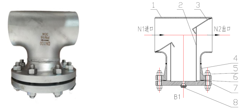 1、進(jìn)口法蘭;2、閥體;3、濾芯;4、斜度板;5、出口法蘭;6、緊固件;7、中部法蘭;8、墊片;9、盲板; 10、排污口;