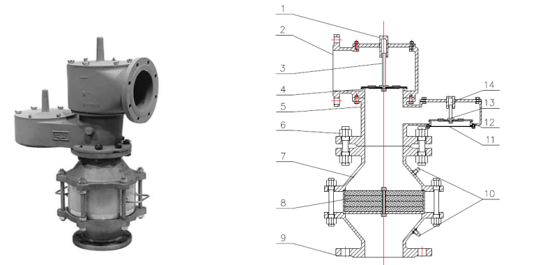 1、限位套桿;2、呼出口接管法蘭; 3、正壓閥桿閥盤(pán);4、正壓閥座;5、呼吸閥閥體;6、緊固件;7、阻火器閥體;8、阻火元件;9、連接法蘭;10、吹掃口;11、防塵網(wǎng);12、負壓閥座;13、負壓閥桿閥盤(pán);14、閥蓋;