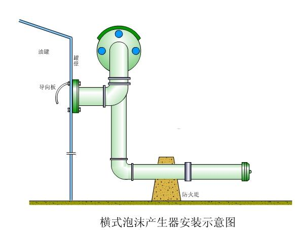 當泡沫混合液流過(guò)產(chǎn)生器噴咀時(shí),形成擴散的霧化射流,在其周?chē)a(chǎn)生負壓,從而吸入大量空氣形成空氣泡沫,空氣泡沫通過(guò)泡沫噴管和導板輸入貯罐內,沿罐壁淌下,平穩地復蓋在燃燒液面上。