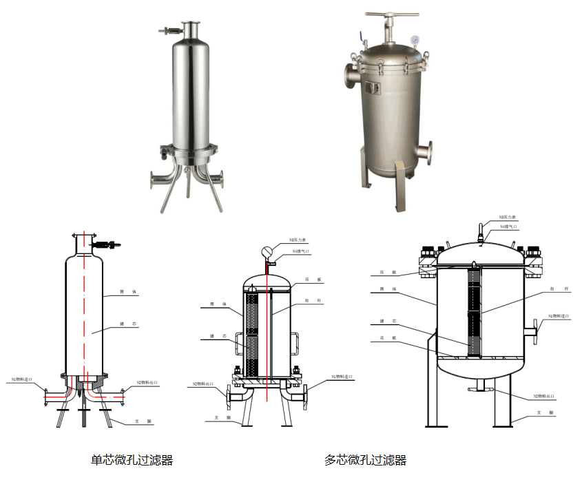 不銹鋼微孔過(guò)濾器,由折疊式微孔膜濾芯和不銹鋼外筒組成,內裝配單芯或多芯濾芯,濾器筒體采用快裝卡箍或快開(kāi)環(huán)首螺栓連接,裝卸濾芯、清洗濾器十分方便。濾器內表面均做鏡面拋光處理(粗糙度Ra≤0.28μm),無(wú)衛生死角,符合“FDA”“GMP”規范要求